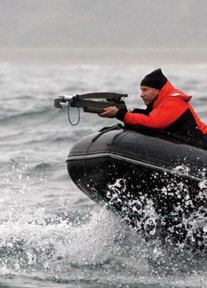 在堪察加半島海域飛馳的橡皮快艇上,普京趴在船頭射鯨,這是為了取得一小塊鯨魚皮膚用作科研。當射中后,普京相當興奮,對記者大喊:“我射了4次,終于射中了!倍霈F在中文媒體的標題則是:《普京射鯨》。還射了4次。