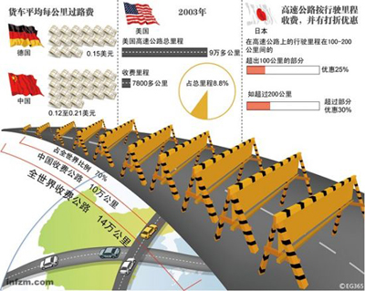 “中國高速公路通行費和國際相比偏高!笔澜玢y行在2007年的一份報告中認定。受高通行費的影響,中國成為了全球物流成本最高的國家之一。據統計,在中國,全社會物流總成本占GDP比重的21.3%左右,而發達國家則是10%左右。與我國幾乎全部收費的7.4萬公里高速公路不同,2003年美國高速公路總里程為9萬多公里,其中收費里程僅為7800多公里,約占8.8%。