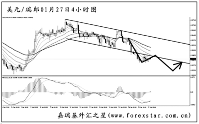 ▲美元兌瑞郎逐步下行,短線的力度有所增強,已經將圖中震蕩區間的下沿跌破,短線主客觀方向均下看。從日線圖上分析,中線的跌勢將一直延續,下方的強支撐在去年底的低點0.9300,預計匯價將向此一帶發起沖擊,但考慮到此前反彈的動能較強,直接跌破的概率不大。
