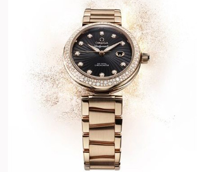 歐米茄Ladymatic18K紅金女表采用紅金表鏈,搶眼的黑色表盤上,小時刻度鑲嵌11顆晶瑩美鉆,另有日期視窗。表圈以“雪花鑲嵌”的手法鋪就大量鉆石,盡呈華貴典雅之美。此表款可謂內外兼修,采用歐米茄獨有的8521同軸機芯,搭配“Si