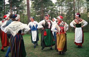 赫爾辛基市一居民區的老年婦女經常匯集在一起,身穿民族服裝踏歌而舞。新華社記者 陳金嵐/攝 |