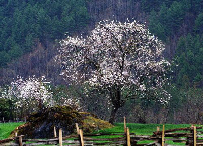 位于林芝縣的嘎拉桃花村,也是賞桃花的最佳地點。一排排盛開的桃花在臺階式綠色麥田的襯托下,整個山坡如同藏族婦女的圍裙耀眼奪目。游客來到這仙境般的桃花村,不僅可以領略到藏族姑娘的熱情好客,還可以體會到勞動的歡樂場面。