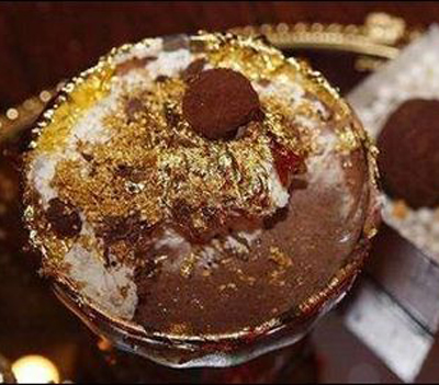 這款巧克力圣代冰激凌由紐約著名餐廳“奇緣3”店主斯蒂芬·布魯斯和珠寶商合作創出,含有28種可可,其中14種全球稀有昂貴。圣代頂部生奶油覆蓋一層金箔和售價高昂的松露巧克力,主體巧克力中混入5克可食23K黃金。