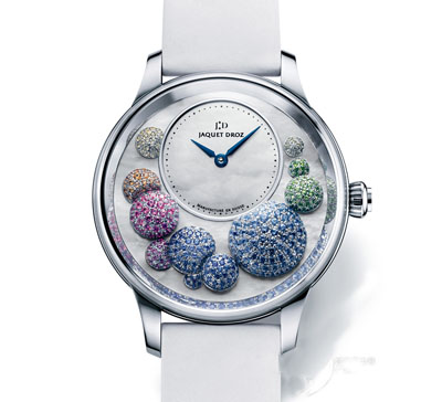 采用雅克德羅自動上弦2653機芯,手表直徑41毫米,18k白金表殼,珍珠母貝表盤,上鑲35顆黃寶石,154顆藍寶石,51顆粉色寶石,22顆橙色寶石以及46顆石榴石,限量發售8只