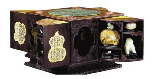 清初的國力強盛,民生安樂,文風又盛極一時,能工巧匠勤于創作,而乾隆尤篤好風雅,不但書畫銅器是其所好;即使竹、木、牙、骨之類;金、銀、晶、玉之屬,亦皆在其搜羅之列。是以上自三代,下迄明清的文玩,大量集聚于宮中。日理萬機的乾隆常常利用余暇欣賞宮廷收藏,甚至下旨工匠照樣仿制出袖珍品放在身旁的小型寶盒中,方便隨時把玩,這就是多寶格,意謂收納許多寶物的小柜。因此,人常戲稱多寶格為“皇帝的玩具箱”。