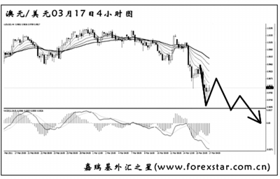 ▲澳元兌美元未能創出1.0255的新高,短線急速下行,階段性的頂部基本構筑成功。從圖中看,澳元此波下跌的力度較強,預計匯價再度轉為上漲的希望不大。日線圖道氏理論顯著低點的支撐在0.9535,在跌破此價格前,只可以小倉做空澳元,待攻破此位置后再行加倉不遲。