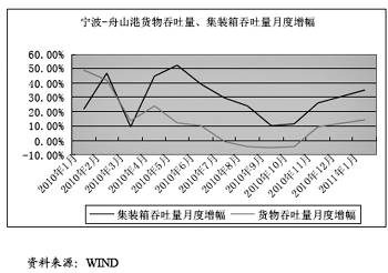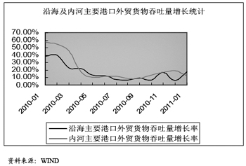 山西證券業提供了一組數據證明該板塊運行業績比較平淡。據報告介紹:2011年1—2月份我國主要港口外貿貨物吞吐量完成4.33億噸,同比增長10.2%,較2011年1月增速回落3.3個百分點,較2010年增速回落3.97個百分點。受2月份集裝箱吞吐量大幅下降拖累,2011年1—2月集裝箱吞吐量增速回落幅度較大,較2011年1月份增速回落4.20個百分點,較2010年全年增速回落5.99個百分點。
