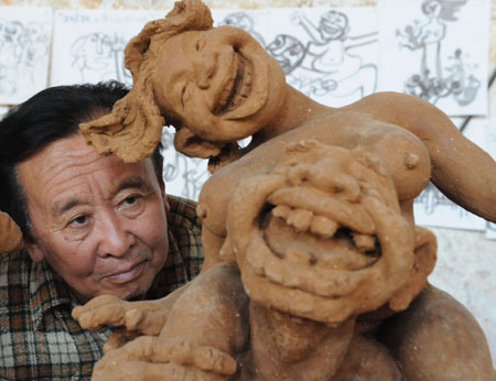 圖為在天津薊縣泥塑創作室,農民雕塑家于慶成創作農村題材新作品。