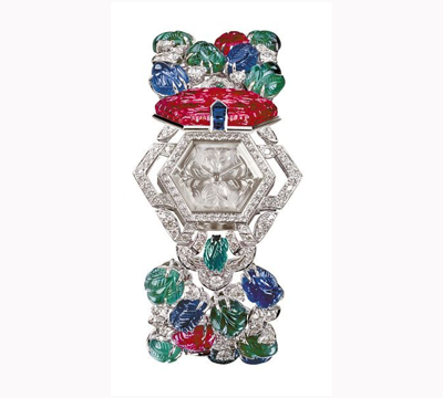 卡地亞Mille et une heures 系列tutti frutti風格神秘腕表,腕表仿若包裹在絢麗多彩的紗麗之中,飾以紅寶石、祖母綠和藍寶石的tutti frutti(水果錦囊)風格的三部曲。