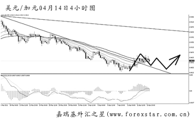 ▲美元兌加元將下降趨勢線突破,同時小幅升穿了4小時圖的均線系統以及道氏理論顯著高點的阻力。加元相比澳元走勢偏弱,所以若預測回調,美元兌加元的風險要更低一些。從現在的情況來看,美元兌加元再度下行挑戰0.9060一線支撐的希望已經不大,等待上漲動能暴發后,可適當尋找小倉入場做多的機會。
