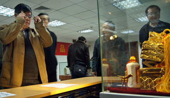 一瓶被譽為“酒王”的“精裝漢帝茅臺酒”成交價高達890萬元,刷新了茅臺酒拍賣成交價格的歷史紀錄。新華社發(彭年/攝) |