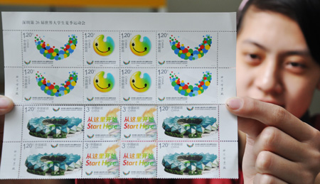 5月4日,一名集郵愛好者在展示她購買到的《深圳第26屆世界大學生夏季運動會》紀念郵票。當日,由中國郵政發行的《深圳第26屆世界大學生夏季運動會》紀念郵票在蘇州發行。該套紀念郵票一套4枚,內容分別為“會徽”“吉祥物”“大運中心”和“主題口號”,全套郵票面值6.6元。