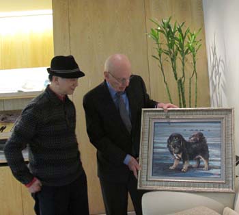 5月4日,在美國紐約曼哈頓的新聞集團大廈,傳媒大亨默多克(右)與中國著名的東方畫獒大師林躍欣賞藏獒油畫。林躍以畫藏獒聞名中國畫壇,近幾年逐漸為世人所知。當默多克在網上看到林躍的藏獒油畫后,表示一定要擁有一張藏獒油畫,今日他如愿以償。新華社發(李群子/攝) |
