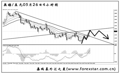 ▲歐元兌美元在下降趨勢線和均線系統的壓制下持續走低,日線圖上看,下方近期已沒有明顯能夠依托住匯價下行的支撐位。圖中MACD持續發生了底背離信號,目前匯價構筑出一個旗形下跌中繼形態,現正在考驗形態上沿,預計歐元直接大幅上沖的概率不大,后市將以沖高回落為主。