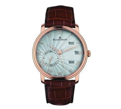寶珀推出的Villeret兩地時年歷腕表,徹底顛覆過去的排列形式。所有日歷信息都顯示于表盤右側,且以人們慣用的敘述順序布置,由上至下分別為星期、日期以及月份。