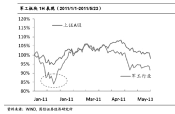 2011年5月份,軍工板塊依然維持弱勢格局,行業整體同步于大盤,目前軍工行業估值水平約為58倍。5月份統計的40只軍工板塊的股票超過半數走勢弱于大盤。我們認為軍工行業依然處于成長期,具有國防和民用雙重成長空間,我們對行業持中長期看好觀點,但短期內行業受市場整體估值水平下調影響依然有調整壓力,需要繼續等待調整后的買入機會。