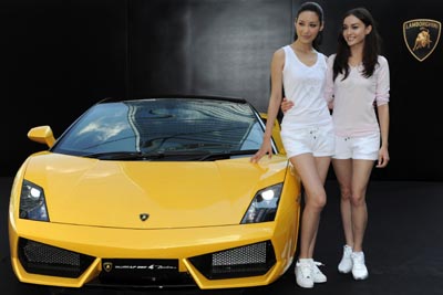 全新蘭博基尼Gallardo LP 560-4 Bicolore特別版超級跑車日前正式在香港推出。這款Gallardo跑車采用了雙色面漆,由車頂至車尾發動機蓋都噴涂黑色車漆,而車身則為橙黃色,突出動感十足的車身線條。該車配備的V10發動機擁有560匹馬力,從靜止加速至100km/h僅需3.7秒,最高時速可以達到325km/h。圖為模特劉碧麗(右)、姚予睛參加新車發布會。