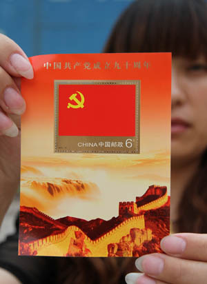 為紀念中國共產黨成立90周年,中國郵政于6月22日發行《中國共產黨成立九十周年》紀念郵票,包括1套共6枚的主題郵票和1枚小型張,6枚郵票分別以《開天辟地》、《烽火歲月》、《執政創業》、《改革大潮》、《世紀跨越》、《科學發展》為主題。圖為河北省邯鄲郵政局的工作人員在展示《中國共產黨成立九十周年》紀念郵票小型張。