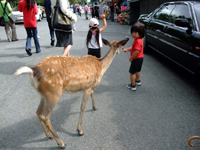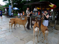 奈良的鹿“懂得”商業規則。鹿餅攤上擺著的鹿餅,雖垂口可食,但絕不伸嘴,就坐臥在旁邊等著游客來遞錢購買?匆娪腥诉^來,鹿也站起身,在你后面靜等。游客交了錢,鹿餅包剛拿到手,它們就蹭過來,挨著你的身體跟戀人似的“親密接觸”,也不管你怕不怕、嫌不嫌。反正那意思就是——你不就是為我買的嗎不給我吃給誰?你要是顯得摳門兒,只喂給一小片就把煎餅包要藏進自己的口袋或者高舉起來扭身便走,脾氣不好的鹿可能就會叼住你的衣襟嚇得你呀呀嗷嗷亂叫。而比較紳士淑女的鹿呢,就會拉開半米的距離向你鞠躬,姿態相當優雅。