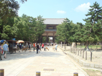 東大寺位于奈良公園偏西側,是觀光勝地。近鐵電車奈良站下車一出站,走不幾步就會遇上鹿。聰明的鹿多半等在出售鹿餅的攤床旁邊。鹿餅原材料是米糠,加少許面粉壓成,但不含任何香料糖分。小孩巴掌大小的鹿餅約三四毫米薄厚,膨松香脆,人亦可食。路邊攤床賣的鹿餅每包10枚,標價150日元。收益中有一部分用來充作鹿愛護會經費。