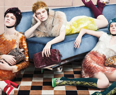 Prada 2011秋冬廣告大片出爐,由著名攝影師Steven Meisel掌鏡拍攝,超模Frida Gustavsson、Kelly Mittendorf、Ondria Hardin共同演繹。