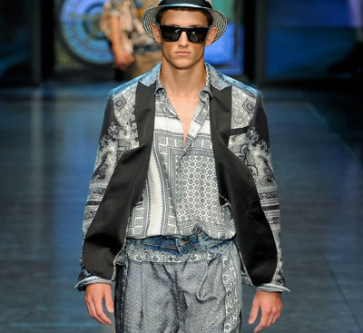 Gabbana在2012春夏的D&G男裝系列中,把印花絲緞用了個徹底:隨意卷起袖口的寬松襯衫、松松垮垮的低襠錐形長褲、及膝卷邊短褲甚至是平底鞋都印著精致繁復的圖案,佩斯里腰果花紋、航海圖、中東風情的幾何圖案與曲線花紋、歐洲貴族式的徽章圖案……單看這些花紋,真的好像一場涵蓋了世界各國的藝術展。