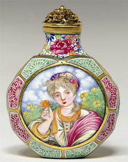 高價成交的銅胎畫琺瑯鼻煙壺壺體通常為扁圓的基本造型,偶有六方、圓形以及特異形,主題紋飾常見人物、花卉、瓜果、動物、山水等紋飾,如開光內繪西洋人物、仕女圖、五福人物、山水人物圖,樹木花卉、百花、蓮池、喜報春先圖以及錦雞玉堂富貴、鵪鶉詩文、花鳥、西洋鐘表圖等等,像2007年香港佳士得以360.75萬港幣拍出的清代西洋表銅胎畫琺瑯嵌珍珠葡萄鼻煙壺那樣的奇異造型者,極為少見,僅發現臺北故宮博物院收藏有2件類似品。