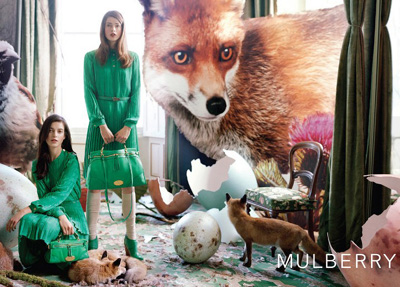 MULBERRY 2011秋冬廣告大片由攝影師Tim Walker掌鏡,超模Tati Cotliar、Julia Saner聯袂演繹。較春夏的暗調使模特們有些模糊于繁復的背景中,這次鮮亮的綠色裙裝照明顯更加搶眼。此次大片的拍攝地點在牛津郡,場景設計由Shona Heath完成,巨型動物的森林場景主題極具奇幻色彩。