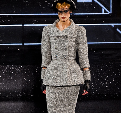 從黑色、灰色到夜空藍,如果只看這一季的作品,實在會讓人覺得Karl Lagerfeld(卡爾·拉格菲爾德)是一位暗色調的癡迷者。少量的白色服飾也要加入黑色的紋樣裝飾或是籠上一層黑色薄紗,裸露在外的臂部罩上暗色薄紗長手套,佩戴著蕾絲面紗的Chanel(香奈兒)女郎們愈發神秘。