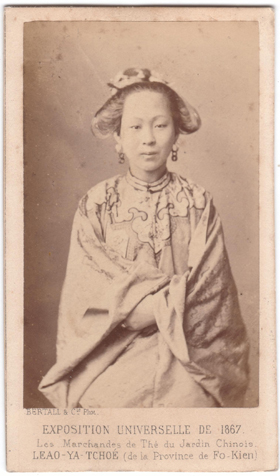 由法國BERTALL照相館拍攝的“參加1867年世界博覽會的中國茶姑念亞彩(右),周雅妮(音)。包括該照片在內的12張CDV照片,在2009年拍出了16萬元人民幣的價格。私人收藏(影易時代供圖)記者 張建/攝 |