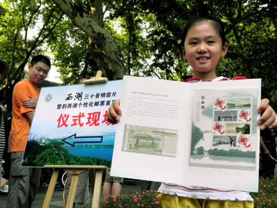 日前,“西湖三十景”明信片暨“韻西湖個性化郵票”首發式在杭州西湖博物館舉行。為紀念杭州西湖申遺成功,杭州市郵票公司發行“西湖三十景”明信片和“韻西湖個性化郵票”郵折。明信片首次以油畫作品形式展現西湖三十景,并配有三十景示意地圖和西湖全景圖。明信片上有國家郵政局特批的“世界文化遺產”標志郵資圖案,刻制了與西湖三十景相對應的風景紀念戳,吸引眾多市民前來購買。 圖為一名小朋友展示購買到的“韻西湖個性化郵票”郵折。新華社發
