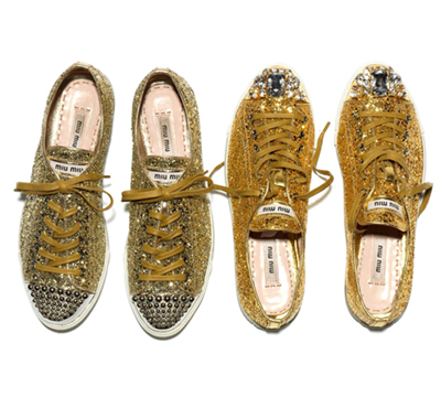Miu Miu(繆繆)這雙鞋子有木有閃到你!運動休閑范兒,也可以這么華麗。層層金色,閃閃發光,簡直太配金秋季節了。 橡膠的鞋底,鞋上還配有金屬鉚釘和鉆石,加上金色的涂層,金色的鞋帶,張揚的個性與時尚氣息并存。不做淑女,不走婀娜的步伐,要的就是大氣和率性。 在Miu Miu 秋季秀場上,如果說T臺是一條悠長的銀河,那么這雙鞋便是銀河里最最耀眼的星!