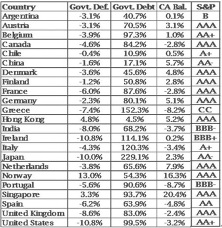 下表為23個國家的政府赤字、債務以及經常帳,下述的數字均為與其GDP的比例。最后一欄是它們的標普評級。