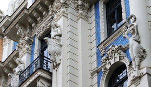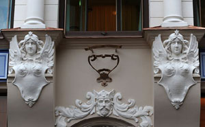 阿爾伯特街、斯特拉涅庫街和伊麗莎白大街是新藝術建筑最集中的區域。我們來到阿爾伯特街轉角處的一所建筑,拍攝整個公寓大樓必須要在路口的另一側,因為街道很狹小,每次試圖拍攝這些建筑全景都不容易。沿著Kronvalda bulvaris街走到盡頭,一一經過那些古老華麗建筑,它們的外立面非常有特色,裝飾性的浮雕石像,從武士、女神、半人半獸、各種動物、植物,甚至斯芬克斯,還有面具都可以堂而皇之地出現在建筑的某個部分,讓人吃驚不已?梢哉f里加這一風格的建筑幾乎代表了全世界新藝術派風格的最高成就。