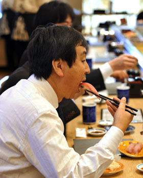 記者注意到,這里壽司上的魚片要比別的地方長,幾乎像一個軟殼從上到下把米飯整個包住。相比之下,米飯的量顯得比其他壽司店少。店主說,在這里,魚和肉的最佳比例也是祖傳的!斑@種比例,可以讓客人將魚的鮮美品味到極致。本來,壽司店里魚是主角,飯是配角。但現在很多快餐式的壽司,反而讓人感覺在吃飯,體味不到魚的香味!