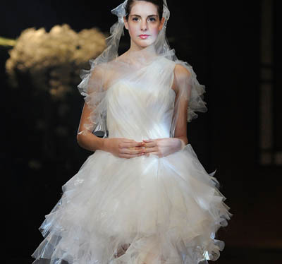 在日本首都東京的一場時裝展上,一名模特展示日本設計師松居惠里的作品。松居注重藝術和科技結合,曾于2009年帶領宇航服設計隊伍設計出零重力婚紗。