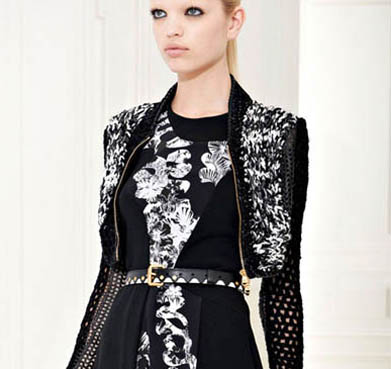 范思哲(Versace)2012早春女裝度假系列 范思哲(Versace)官網圖片,身穿高腰皮革小外套與小翻領上衣的范思哲 (Versace) 女郎顯得更加優雅干練,網眼面料的輕盈感使皮裝不會顯得過于硬朗、沉重。復古緊身胸衣式的上半身輪廓、柔軟而富有曲線美的裙擺、細密閃亮的金屬扣環裝飾、清爽和諧的配色,融合成優雅而富有藝術感的氣質。連身裙則在不對稱剪裁上大做文章,肩部的挖空設計、不規則的裙擺將線條清晰的建筑感與裙裝的飄逸感融為一體,黑白條紋、棕櫚葉子和木槿花圖案作為裝飾,有幾分抽象畫的感覺。