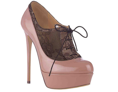 蕾絲依然是Valentino 2011早秋系列重要的設計元素,在鞋履產品上也不例外。蕾絲網布與漆皮拼接設計的踝靴復古優雅而不失俏麗;而浮凸刺繡的蕾絲圖案是本季的新舉,搭配粉褐色的皮革顯得更成熟;蕾絲搭配水晶石的晚裝鞋設計談不上精彩,但足夠精致,露趾高跟鞋、露趾鏤空涼靴和T帶高跟涼鞋三種款式倒是可以滿足各種腳形和服裝搭配。所以2011早秋Valentino的蕾絲鞋總體來講不算驚艷,但也平衡了風格與實用。