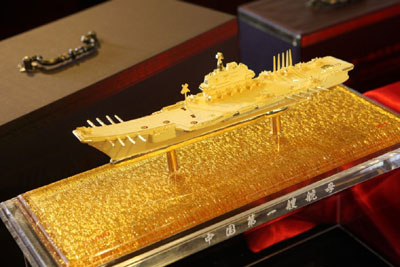 為紀念中國第一艘航空母艦問世,中國人民革命軍事博物館與上海昶昱投資有限公司聯合發行中國第一艘航空母艦模型。據悉,“中國第一艘航空母艦”微縮模型以中國第一艘航空母艦為原型,純金版微縮比例1:1680,采用50克.999黃金純手工打造,全國限量發行50000套。銅鍍金版艦長304mm,艦寬70.5mm,微縮比例1:1000,限量發行80000套。每套均配有收藏證書,且有獨立編號。
