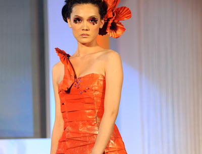 在臺北舉行的“第二十一屆臺北國際化妝品展”上,彩妝師王薇利用宣紙、棉紙、牛皮紙等為材料,運用折疊、編織等手法,制作出別具特色的創意婚紗,頗為搶眼。圖為模特在展示用紙制作的創意婚紗。新華社發