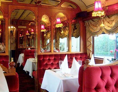 這個移動中的奢華餐廳,處處閃現著濃濃的懷舊氛圍和古典浪漫的風格:考究的波斯地毯,酒紅色長絲絨椅墊,絨布燈罩上面還垂掛著金色的流蘇,100年前的時尚在今天看來還如此地令人心動。餐廳每節車廂都配有一名戴著白色高帽的廚師,在略顯局促的空間內變魔術般烹調出各種誘人的美味。開胃菜以鵝肝醬搭配餅干,將粉紫色的鵝肝醬抹在咸味餅干上,將米黃色的鵝肝醬抹在甜味餅干上,據說這種吃法才是最法國式的吃法。前菜有兩種選擇:一是低脂高蛋白的澳洲特產袋鼠肉,二是來自塔斯馬尼亞島的鮭魚;主菜則有秘制醬汁料理的雞肉和上等菲力牛排。餐后甜點是數種口味的起司、蘋果塔和巧克力慕斯蛋糕,此時再喝上一杯香濃的摩卡咖啡就再完美不過了。這樣一頓豐盛的晚餐,周日至周四期間僅收人民幣約455元,相當超值。