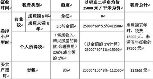 目前,二手房買賣時需要交納的主要稅費為營業稅、個稅、契稅等,其中營業稅及個稅為房產交易時業主需要交納的部分,而契稅的征收對象則為購房者。以一位賣掉一套60平米的小戶型,再買一套150平米的大戶型的換房者為例,中間將產生哪些稅費呢?我愛我家社區專家為您解析: