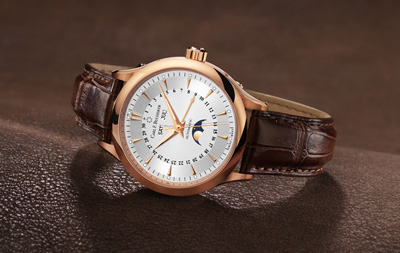 該款Manero月相腕表的特殊吸引力在于它詳盡的萬年歷功能。佩戴者只需瞄一眼戴在手腕上的腕表,通過圍繞表盤中心的指針,就可以對當前日期情況一覽無余。每周日期顯示位于10點鐘位置,同時當前的月份可在2點鐘位置讀取。