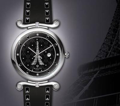 PARIS特有的星云圖案,表柄中間的大鉆石閃耀著明星氣質。手表內圈也是仿制電影膠片的效果,周圍的一圈碎鉆和表中間全鉆的埃菲爾鐵塔造型展示著奢華的力量。同時,表面和旋鈕上都雋刻著MATZO