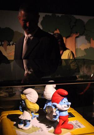 9月28日,參觀者在新落成的比利時首都布魯塞爾漫畫塑像博物館欣賞“藍精靈”。