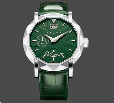 腕表亦貫徹GRAFF高級腕表的特色,在12時位置鑲有一顆三角形切割白鉆,而紋理精致的表盤和真皮表帶,則采用品牌的經典綠色,互相輝映。訂購GraffStar