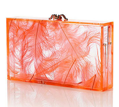 著名設計師品牌Charlotte Olympia近日推出了2012早春系列的晚宴包,四款手包各具特色。分別裝飾黑色和橘色羽毛的玻璃手包個性十足,黑色款高貴神秘,橘色款個性時尚。另有一款可換內部襯袋的玻璃手拿包有豹紋、條紋以及綠色印花三種款式,能夠搭配多種風格色彩的著裝。作為唯一一款麻編刺繡花紋的手拿包,上面繡有動物和風景,配合原色的手袋清新不失淑女本色。