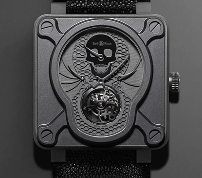 瑞士知名鐘表品牌Bell & Ross推出了萬圣節特別版腕表。Bell & Ross以BR01的表款為原型,設計出了表面為骷髏的造型,表帶為黑色珍珠魚皮。限量發售20只。