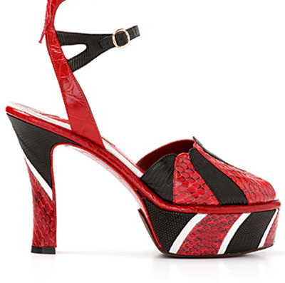 以高檔皮具聞名世界的西班牙品牌Loewe 2012春夏帶來粗細適中的高鞋跟,有了前端防水臺的設計讓舒適度陡增。 這一季,Loewe在鞋子的設計上除了蛇紋拼接的處理以外, 更以抽象的概念將整體花紋構建出結構清晰的視覺感官,讓每一雙鞋都堪稱藝術精品。