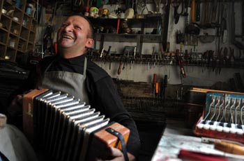 這間8平方米的小鋪子很不起眼,破舊的小店里密密匝匝地擺滿各式手風琴。一角的墻上整齊地掛著鉗子、螺絲刀、銼刀等工具。一張桌前一位高鼻深目的中年男子端坐著,認真地拆卸著一架剛剛送來維修的手風琴。